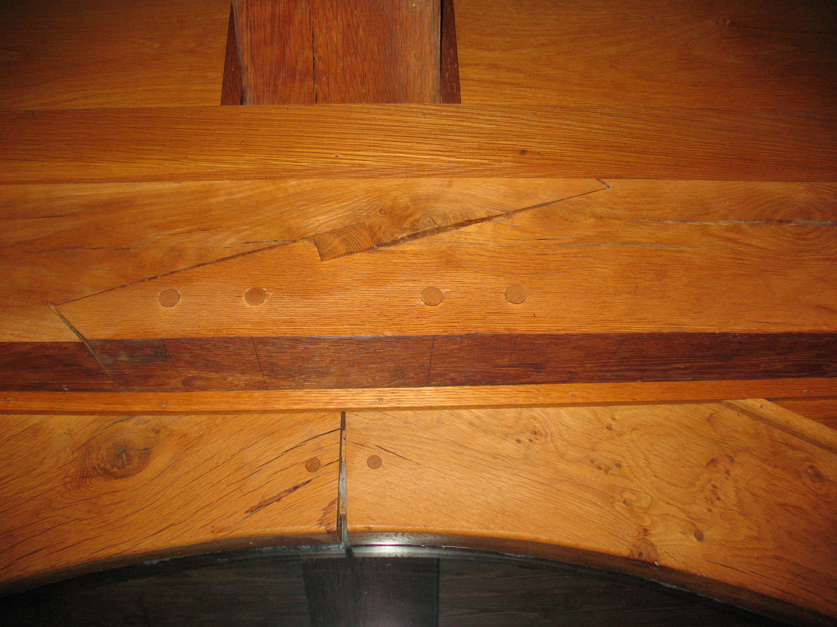 This shows the diagonal bracing on the front wall which frames the fanlight. The braces and cross member at the bottom are all joined to the posts and the beam by pegged mortises and tenons. They are joined to each other by a pegged loose tenon.Pegged mortise and tenons joining bracing members to a post.Stopped splayed scarf joint joining two pieces of a 28′ beam end to end where they don’t meet over a post. Some of the top stop is covered by a piece of trim.