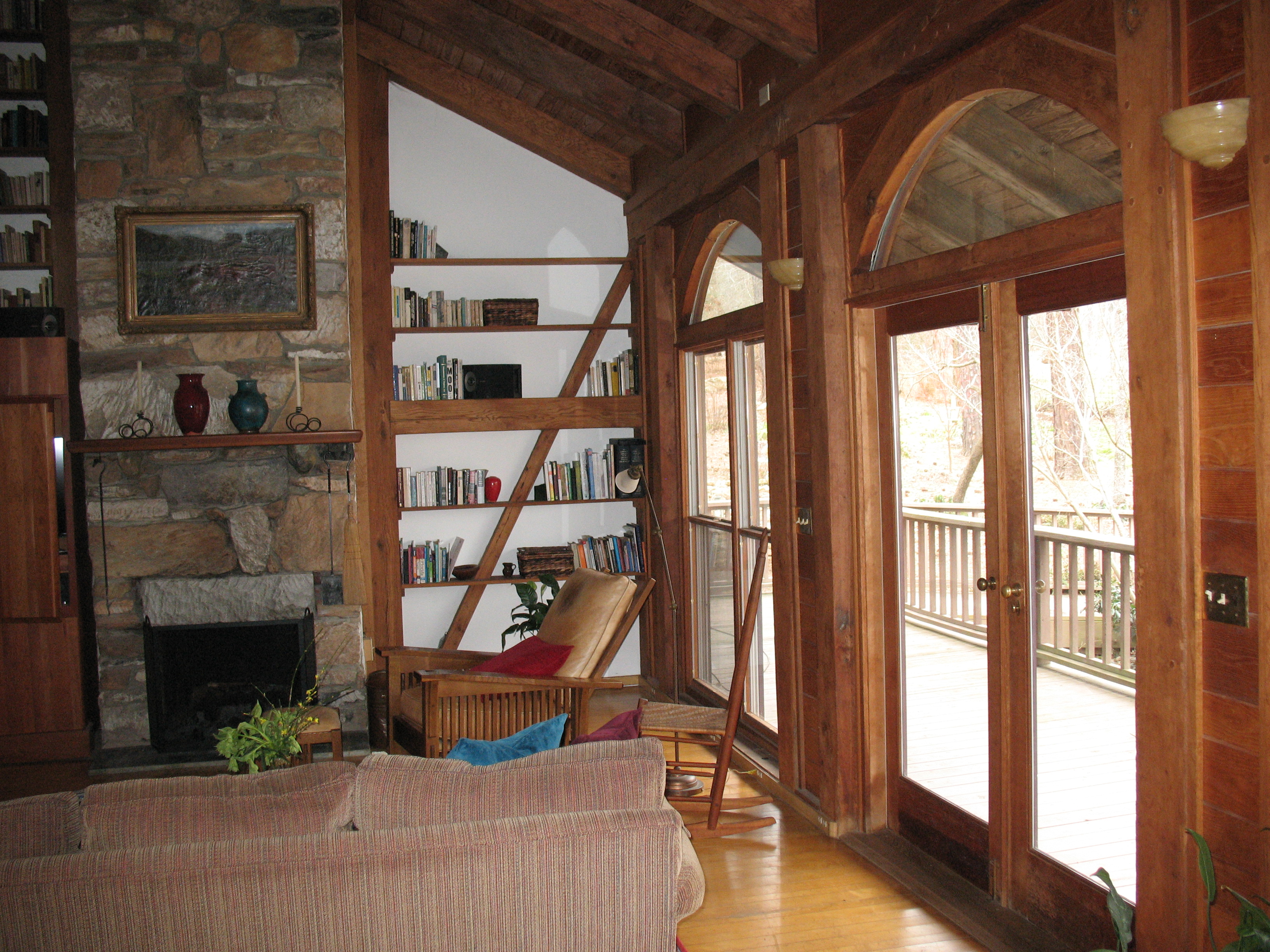 This view of the living room shows the stone fireplace by James “Fuzzy” Monnes, with a heart pine mantel by Bill Wallace. The diagonal brace is connected to the post by a pegged mortise and tenon, to the horizontal beam by a half lap, and to the floor joist by a pegged half lap.